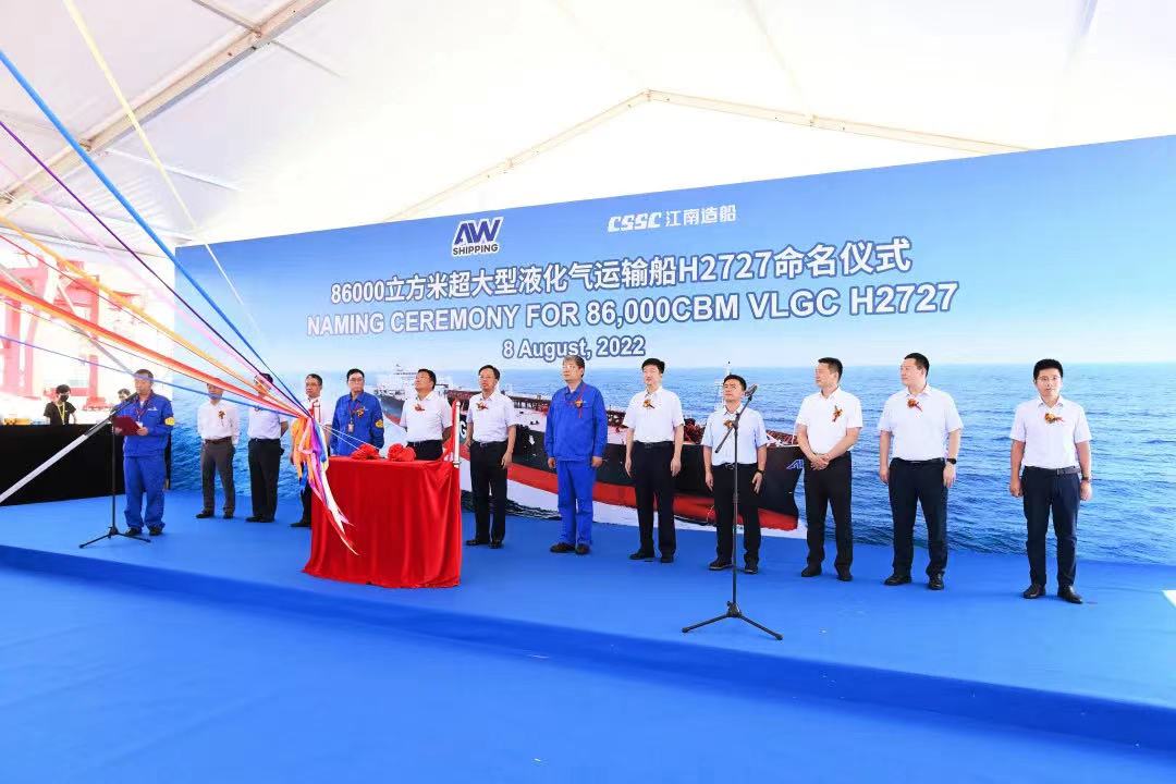 近日,由九州官网(以下简称“万华化学”)同阿布扎比国家石油公司联合成立的合资公司AW Shipping Limited与中国船舶集团旗下江南造船合作建造的第一艘船举行命名仪式,万华化学董事长廖增太,总裁寇光武出席剪彩仪式并为新船命名。