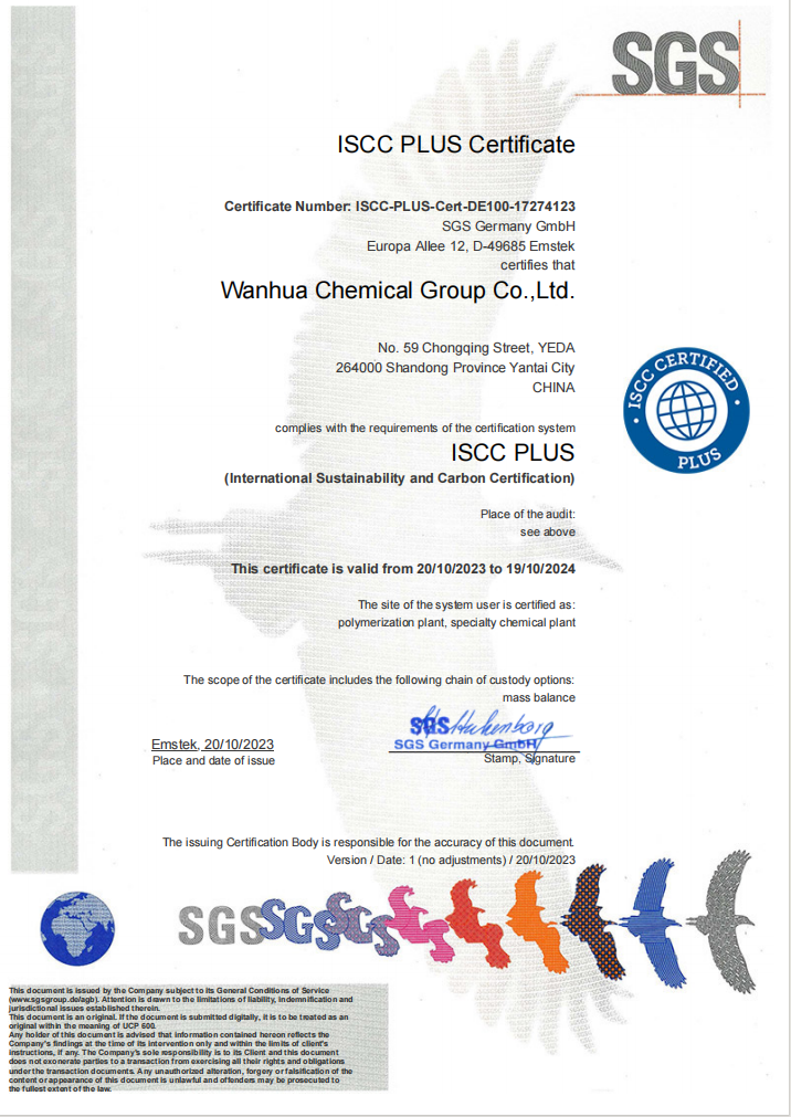 这一认证说明证明产品具备可持续生产流程,确保产品生命周期的最小环境影响,是我们为环境和社会做出贡献的一项重要贡献。万华化学将继续加大在可持续生产的投入,使用可持续原材料来生产并供应低碳足迹产品,推动提升行业价值链的可持续发展。
