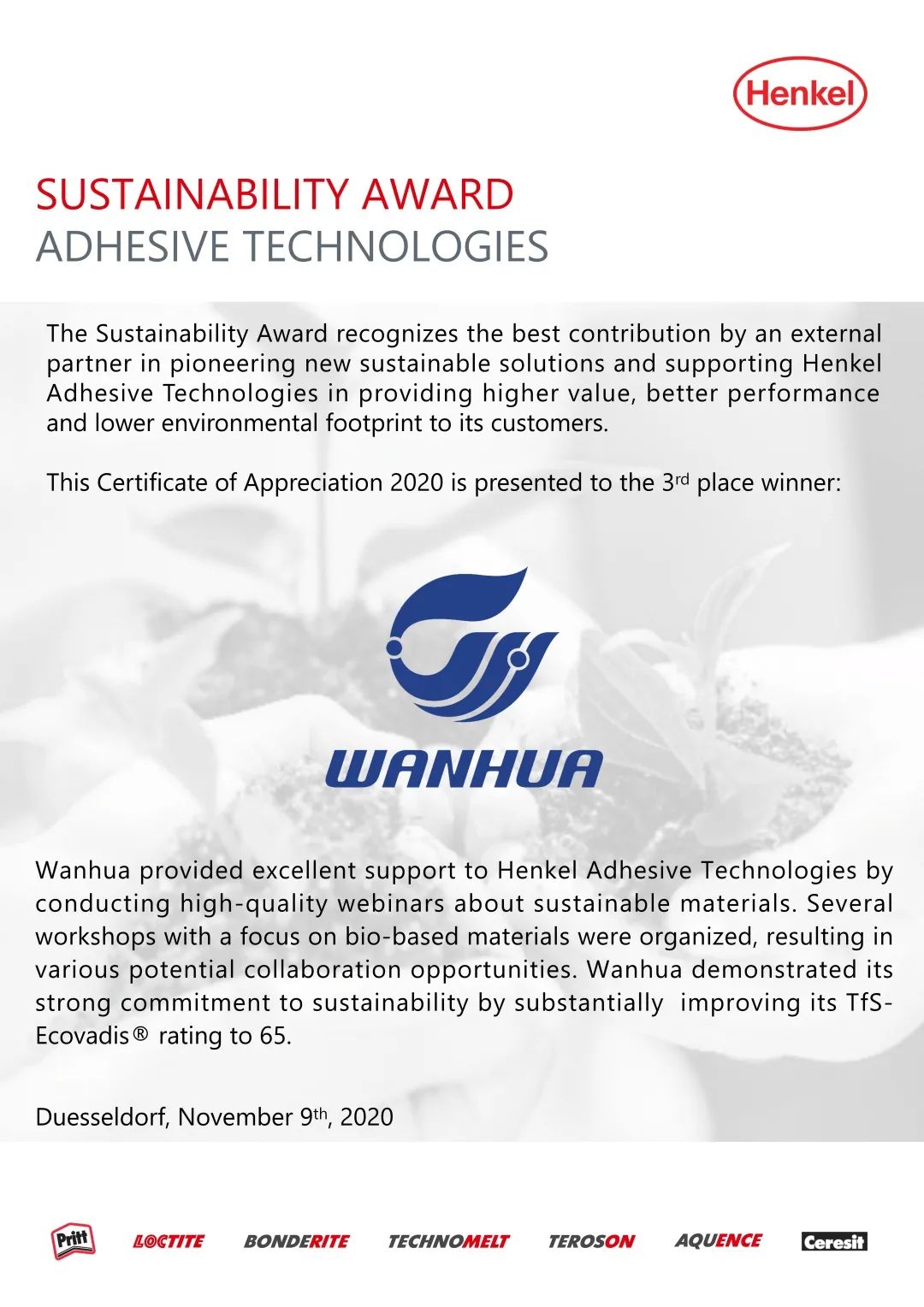除此之外,凭借对可持续发展的卓越贡献,万华化学同时荣获汉高可持续供应商。未来,万华化学将继续通过不断开发符合消费需求且具有竞争优势的创新产品,与汉高携手共同引领行业良性发展,创造人类美好生活!