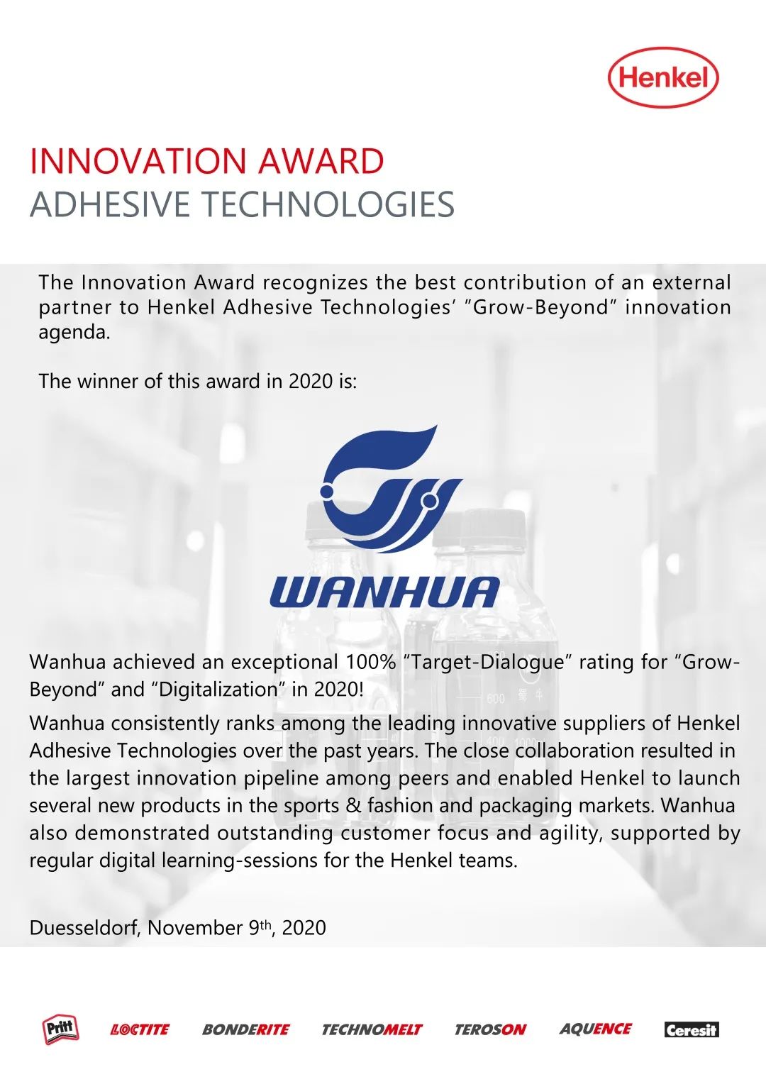 2020年11月10日,九州官网(以下简称万华化学)荣获汉高粘合剂技术2020全球最具创新供应商,该奖项充分肯定了万华化学在创新方面的出色表现。