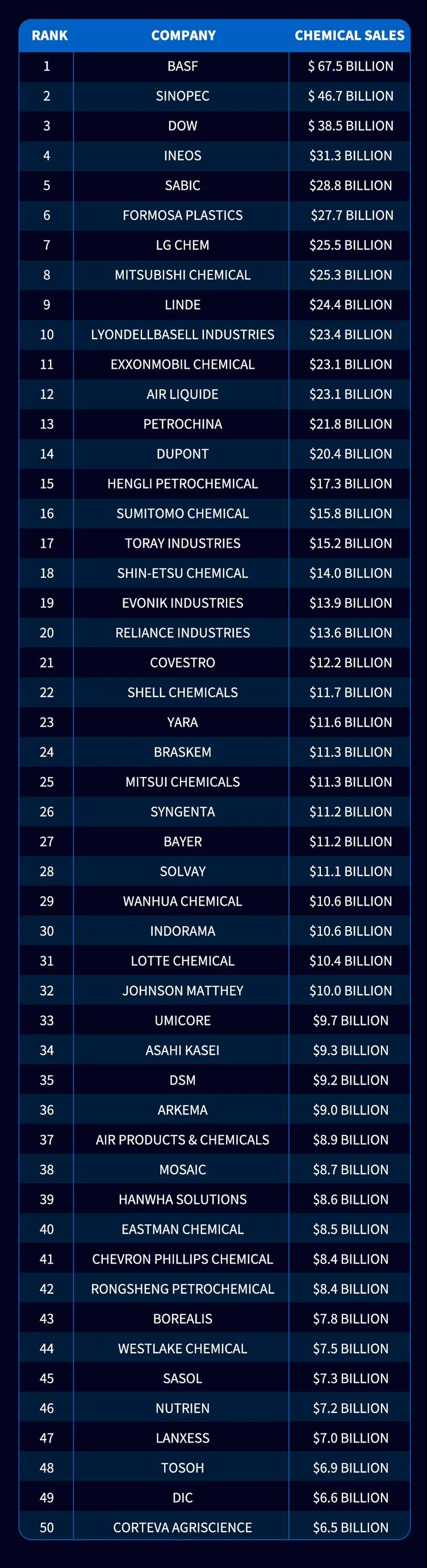 全球化工50强 | 万华化学位列第29名!