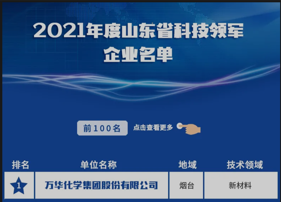 10月29日,2021年度山东省科技领军企业名单发布,万华化学凭借优异的创新发展绩效位列全省200家科技领军企业第一名!