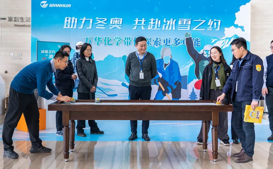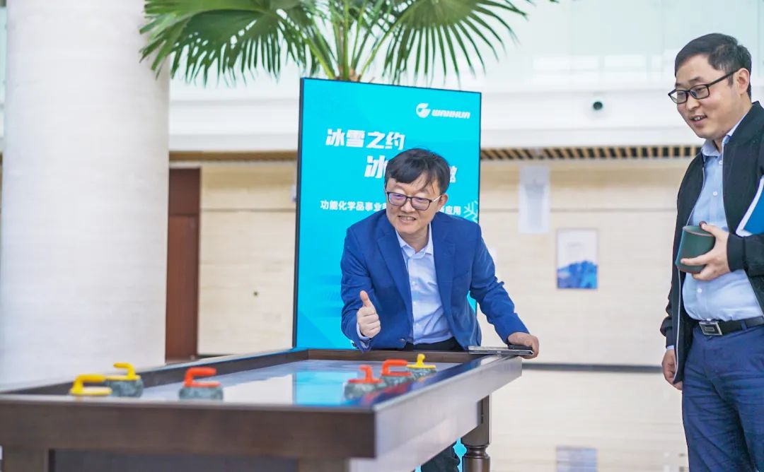 在互动体验区,台式冰壶展示桌吸引了大家的目光。以脂环胺WANAMINE®H12MDA和异氰酸酯三聚体WANNATE®HT为原材料的天冬树脂,是制备液态合成冰的优异材料,其凭借自润滑、耐刮擦,且摩擦系数极小等优势,是目前最接近真冰的合成冰。液态合成冰无需低温下保存维护,低能耗、更环保,打破了气候条件对于冰上项目的限制,随时随地即可享受冰上运动的乐趣。